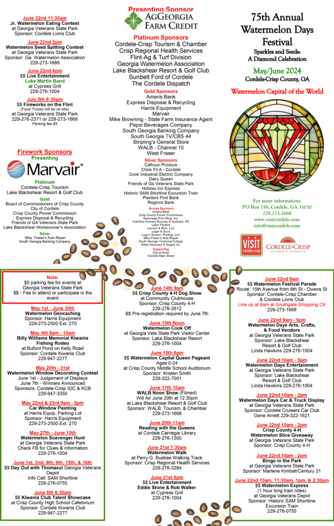 Watermelon Festival 2024 In Cordele Ga Nedi Tanhya , Festival activities include the annual watermelon days parade, watermelon dance, the watermelon eating contest, the watermelon chunking contest, the sweet melon & adult seed spitting contest, watermelon gospel.